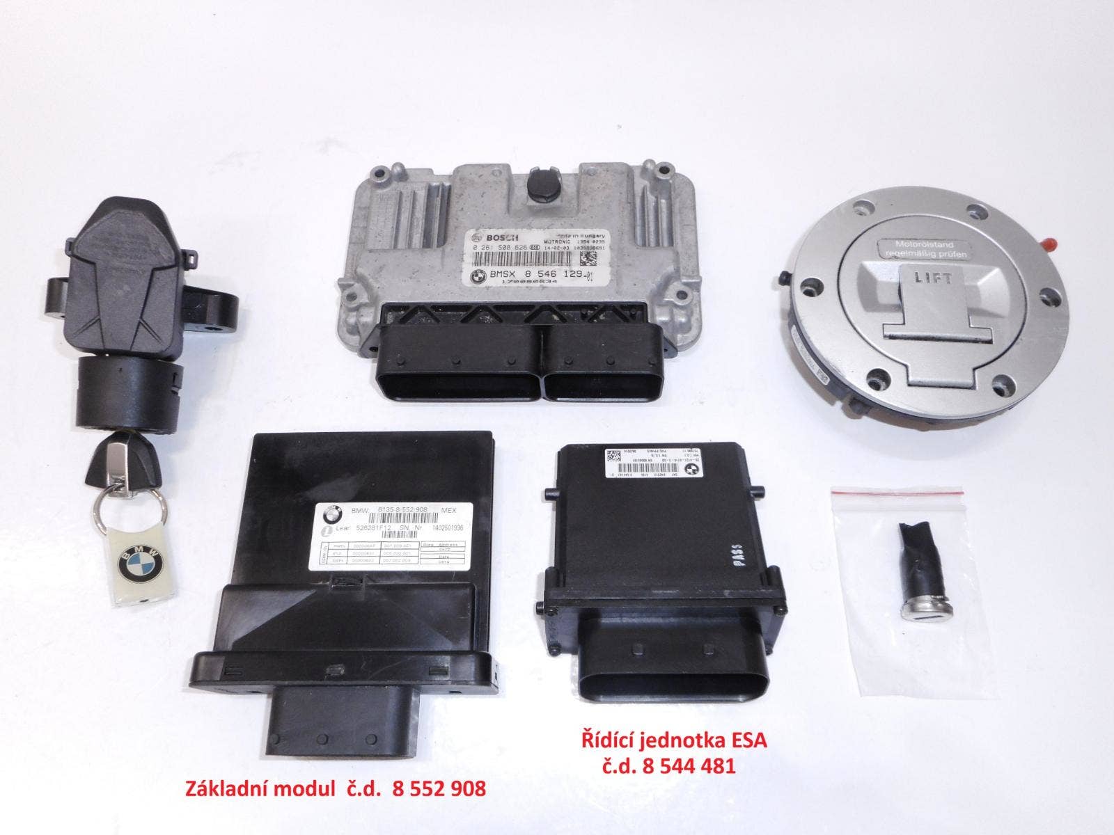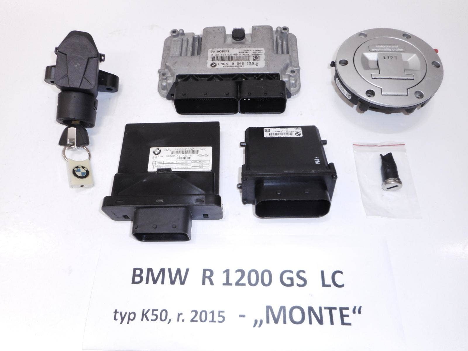 Víčko má nefunkční vložku zámku (seknutá stavítka). Zámková sada včetně řídících jednotek pro motor, ESA podvozek a základní modul. Jako celek je sada výhodná pro kompletní spárování vůči diagnostice. Možno zakoupit i bez řídících jednotek ESA a základní modulu. Díl pochází z rakouského motocyklu BMW R 1200 GS LC, r. 2015. - ("MONTE"). Při použití na jiný model, ověřte před objednáním kompatibilitu. Více dílů na webu automotocerveny. cz
