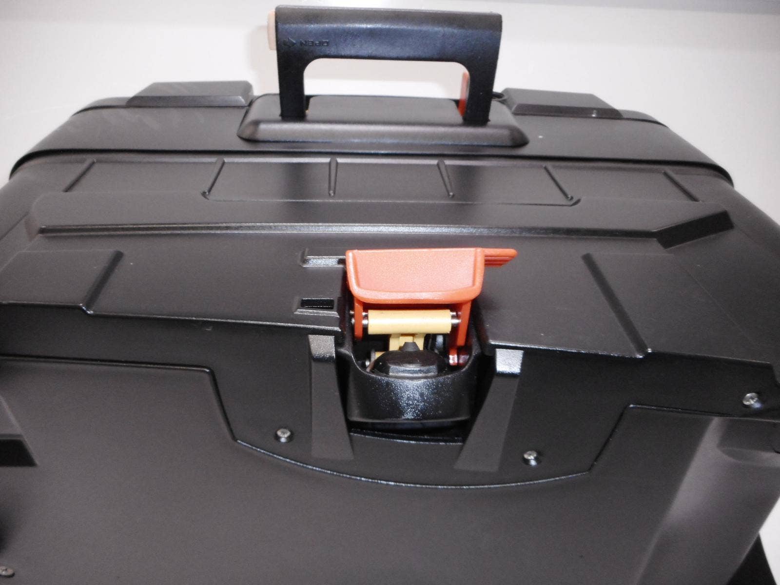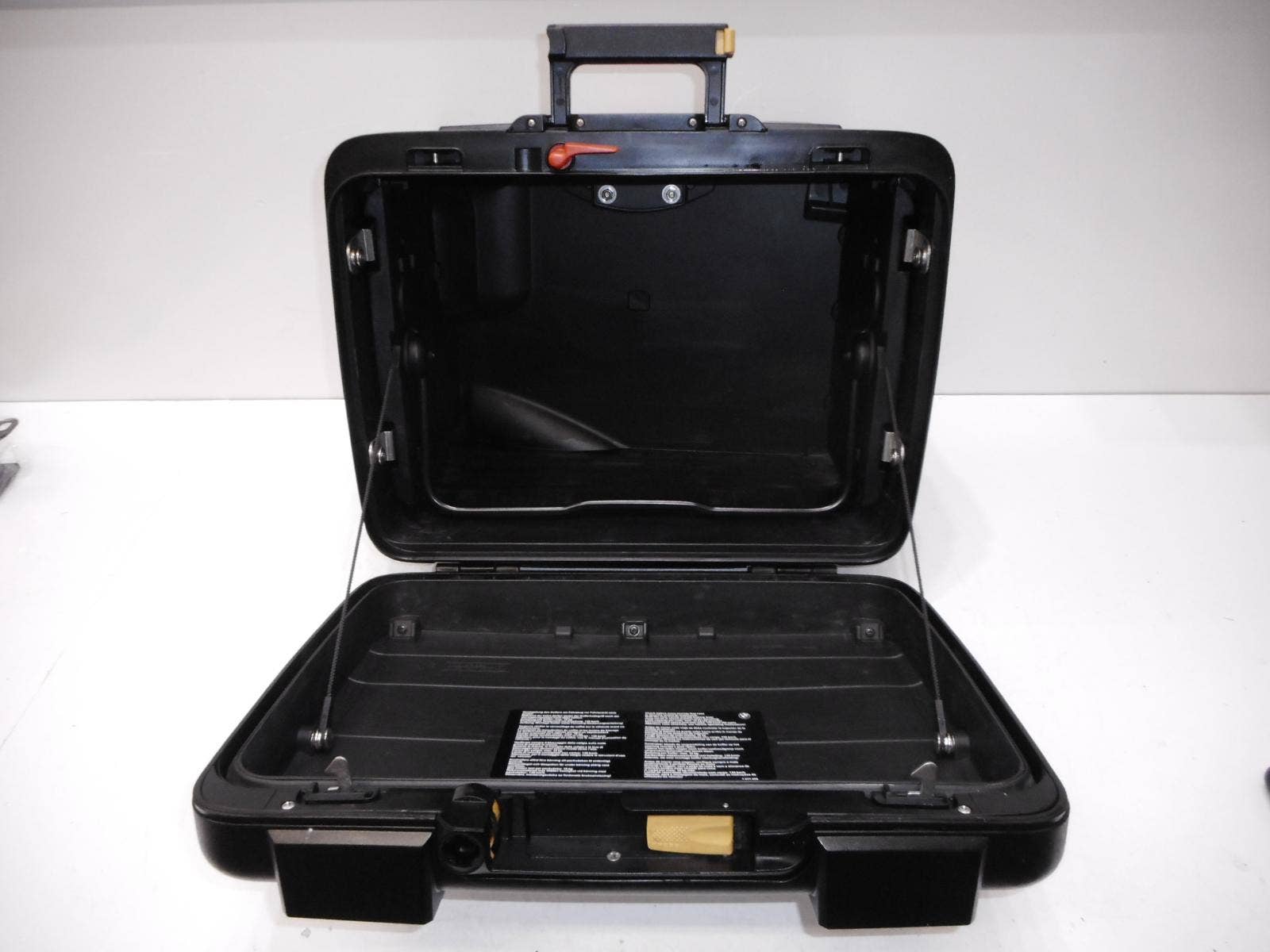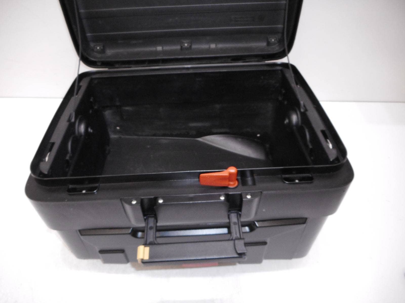 Kufr má ulomený jeden horní úchyt + oděrky (viz. foto). Veškeré upínání, zavírání i roztahování je funkční. Může být dodáno včetně vložky zámku.